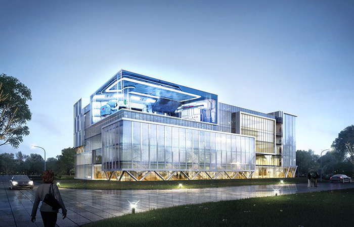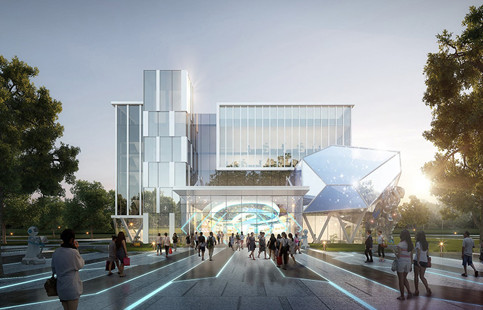 項目以科技“模方”,動感“魔石”,智能“膜屏”為設(shè)計理念, 采用模塊設(shè)計手法,將模方單元的組合形成虛實結(jié)合的建筑形態(tài),模方單元內(nèi)白色龍骨陣列排序,打造時代科技框感;采用不規(guī)則形體設(shè)計手法,融入能量石的設(shè)計元素,設(shè)計中機(jī)器人背抗能量石,增加機(jī)器人與建筑的互動,打造機(jī)器人智能基地門戶標(biāo)致;采用3D裸眼屏等高科技技術(shù)賦予建筑表皮,將科技與智能產(chǎn)品于室內(nèi)室外進(jìn)行多方位展示,打造出獨一無二的人工智能IP級視訊窗口。三種手法的運用,共創(chuàng)邯山門戶人工智能基地。