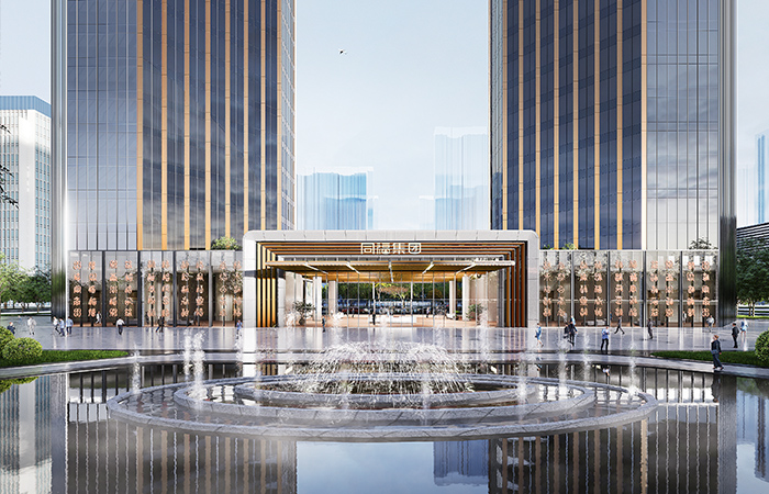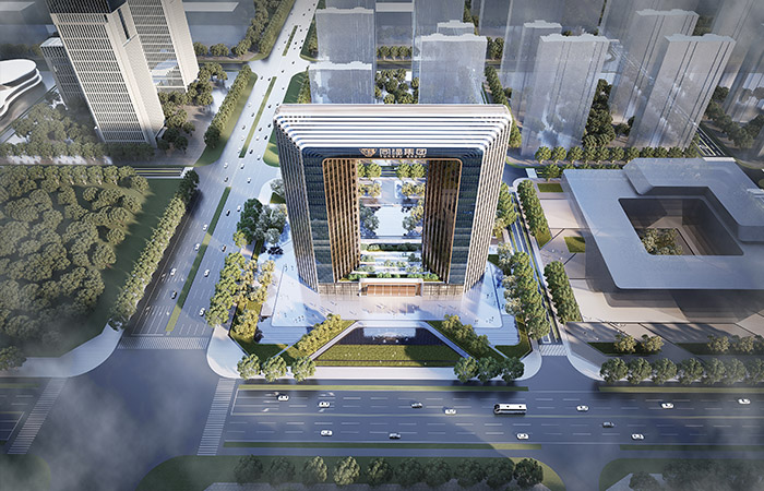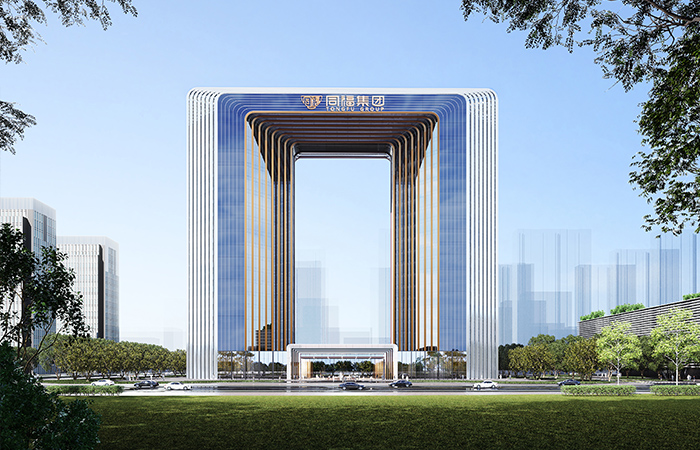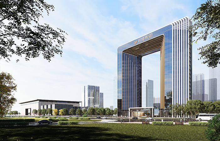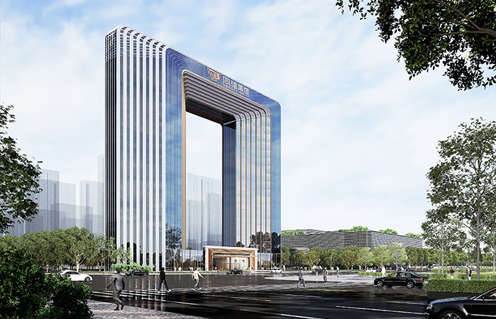項目位于正定新區(qū)“四軸五心”的中央商務辦公區(qū)域內(nèi),隆興路商務軸北側,由兩棟塔樓組成,功能為展廳、會議和辦公,總建筑面積5.8萬 m2,其中地上建筑面積4.2萬 m2。兩棟塔樓均為地下一層,地上21層,裙房2層,建筑高度100.85m,結構高度86.700m。兩棟塔樓平面為八邊形,兩塔樓最近點距離約36.6m,最遠點距離約108.1m。建筑頂部設置八邊形造型和空中連廊與塔樓連為一體,“大道至簡,天下大同”,形成大底盤雙塔連體建筑。