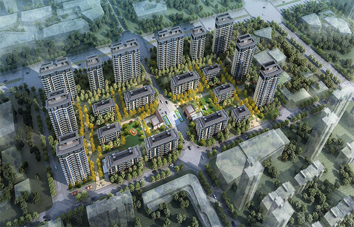 以薈萃城市頂級(jí)資源,引領(lǐng)城市未來居住所向?yàn)橹髦肌A⒚骘L(fēng)格上,住宅以新中式風(fēng)格為主調(diào),形體上采用對(duì)稱的構(gòu)圖,主體顏色采用米白色與淺灰色,整齊大氣的立面能夠規(guī)整城市沿街面,提升城市形象。