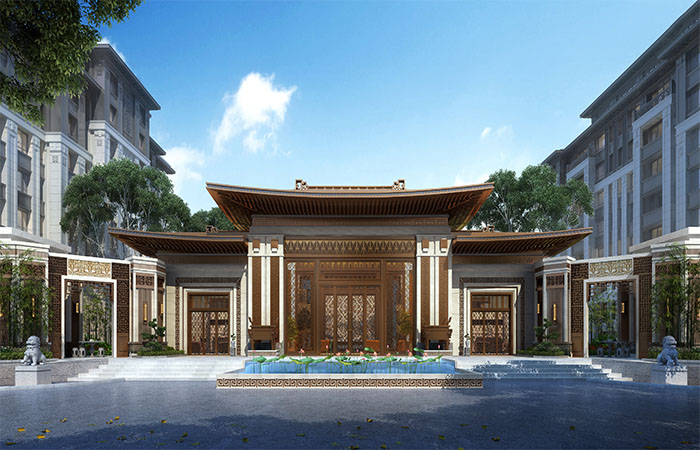 建筑立面整體風(fēng)格以中式為主,為了濃縮中式傳統(tǒng)建筑精髓,彰顯地域特征,采用了中國古代建筑的形制、構(gòu)筑與符號,通過選材和構(gòu)造設(shè)計,彰顯中式建筑的美麗。建筑采用白色、駝色與淺灰作為整體主色調(diào),結(jié)合中式元素,整體效果恢弘大氣。