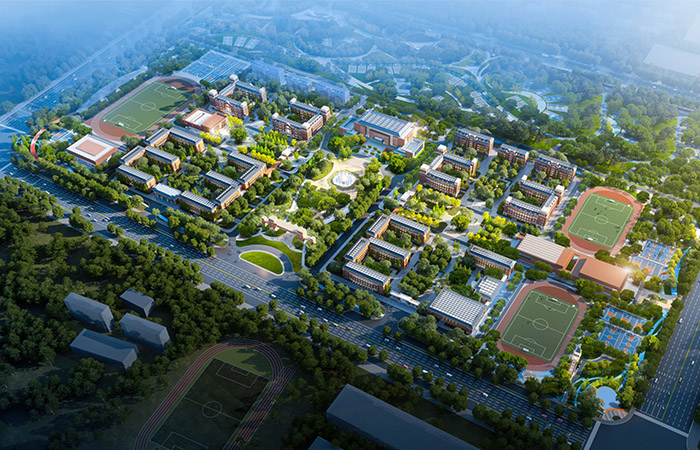 本項目規(guī)劃了36班小學(xué)一所、36班初中一所、60班高中一所。小學(xué)設(shè)置于場地西北側(cè),初中設(shè)置于場地西南側(cè),高中設(shè)置于場地東側(cè),各組團分區(qū)明確,有機聯(lián)系。每個組團內(nèi)教學(xué)樓、宿舍樓獨立設(shè)置,按要求配建獨立的體育館、食堂,以及圖書、行政辦公等建筑,同時采用風(fēng)雨連廊進行串聯(lián),便于師生使用。同時,為提升區(qū)域城市形象,在場地西北角設(shè)置一座鐘樓,北側(cè)中央位置設(shè)置一座儀式感大門。