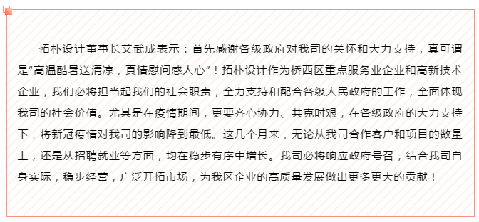 拓樸設(shè)計(jì)董事長(zhǎng)艾武成向副區(qū)長(zhǎng)趙月芬等領(lǐng)導(dǎo)匯報(bào)了我司的疫情防控工作及公司的經(jīng)營(yíng)發(fā)展情況,