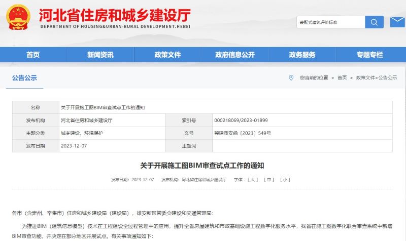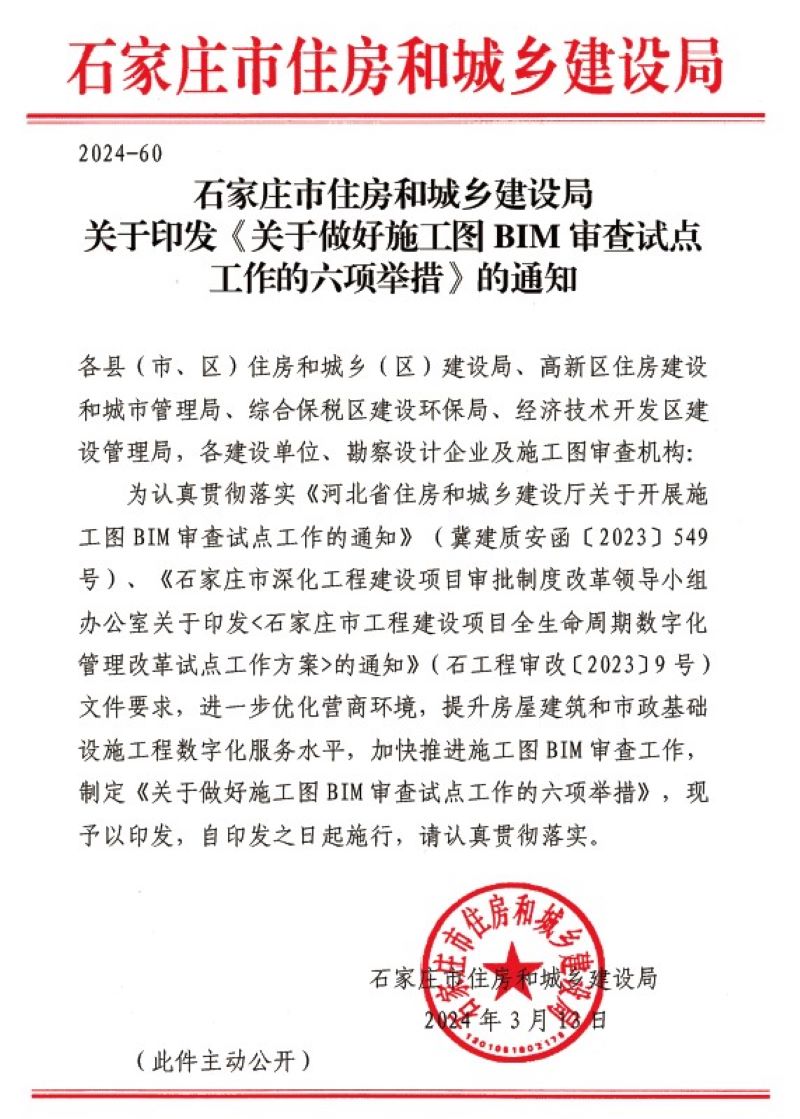 繼2023年12月7日河北省住房和城鄉(xiāng)建設(shè)廳發(fā)布《關(guān)于開展施工圖BIM審查試點(diǎn)工作》的通知,2024年3月13日石家莊市住房和城鄉(xiāng)建設(shè)局印發(fā)了《關(guān)于做好施工圖BIM審查十點(diǎn)工作的六項(xiàng)舉措》的通知,其中第一項(xiàng)舉措就提到了“自2024年4月1日起取得建筑工程規(guī)劃許可證的超高層建筑及政府投資公共建筑、城市綜合管廊、軌道交通項(xiàng)目須進(jìn)行施工圖BIM審查,建設(shè)單位及勘察設(shè)計(jì)企業(yè)應(yīng)登錄河北省施工圖數(shù)字化聯(lián)合審查系統(tǒng)進(jìn)行BIM 審查項(xiàng)目申報(bào),并提交BIM 設(shè)計(jì)成果?!?